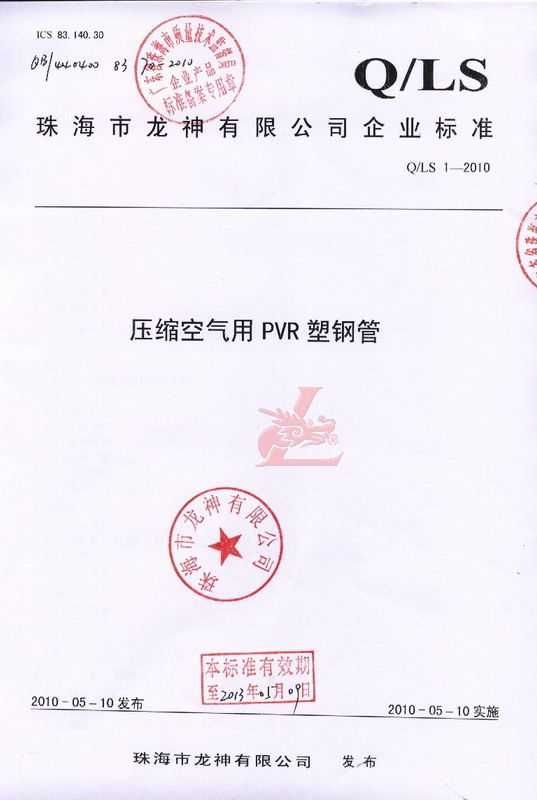 龍神壓縮空氣PVR塑鋼管成功申請企業(yè)執(zhí)行標(biāo)準(zhǔn) 2010年5月珠海市龍神有限公司“壓縮空氣PVR塑鋼管”得到珠海市質(zhì)量技術(shù)監(jiān)督局認(rèn)可,特此頒發(fā)“壓縮空氣PVR塑鋼管企業(yè)執(zhí)行標(biāo)準(zhǔn)”,龍神公司在嚴(yán)格執(zhí)行標(biāo)準(zhǔn)下,保證產(chǎn)品質(zhì)量。 2010-05-20 9649