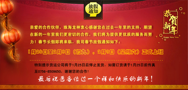 新年好!龍神祝您新年生意興??!我司已上班, 將繼續(xù)竭誠(chéng)為您服務(wù),恭候您的惠臨及來(lái)電0756-8509651 、8509652、8509653
