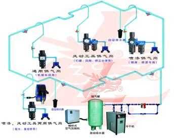 管道不生銹,不產(chǎn)生異味或有害氣體,外觀天藍色。 3)合理設(shè)計: 整個壓縮空氣主管路設(shè)計成全封閉環(huán)形,以保證各供氣點氣壓的均衡。并對主管路實行分區(qū) 分段控制 ,可在不停產(chǎn)的情況下進行檢測及維護工作。