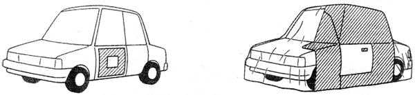 實際維修工作中所要遮蔽區(qū)域面積的大小,與所用的噴涂方法、噴槍的走槍方式、漆霧的散射范圍等都有密切關(guān)系,另外點修補噴涂和塊修補噴涂所用的遮蔽方法也不相同。因此,實際遮蔽工作中必須根據(jù)情況確定恰當?shù)恼谏w范圍,盡量保證在每一種情況下遮蔽的面積最小(如右圖4-3-2)。