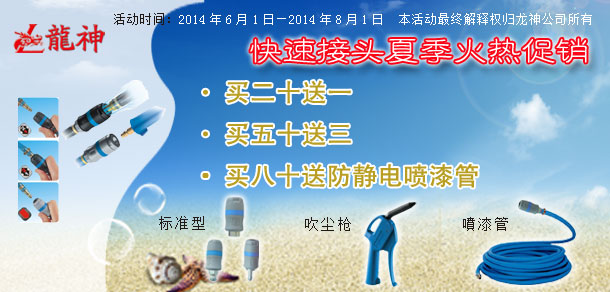 2014年6月法國(guó)佩釜標(biāo)準(zhǔn)快速接頭“爽一夏”讓利大促銷 2014-05-30 43081 1、買二十送一(即買二十個(gè)快速接頭送一個(gè)法國(guó)佩釜快速接頭或法國(guó)佩釜吹塵槍(編號(hào):38016)一把) 2、買五十送三(即買五十個(gè)快速接頭送三個(gè)法國(guó)佩釜快速接頭或法法國(guó)佩釜吹塵槍(編號(hào):38016)三把) 3、買八十送一卷防靜電噴漆軟管(編號(hào):36323)