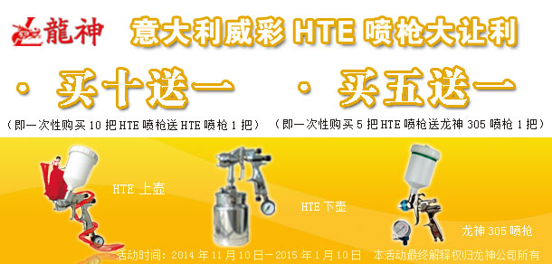2014年11月吉尼斯HTE噴槍"初冬.讓利"大促銷 2014-11-11 16375 活動(dòng)內(nèi)容: 1、買十送一(即一次購(gòu)買十把HTE噴槍送一把HTE噴槍) 2、買五送一(即一次購(gòu)買五把HTE噴槍送一把龍神305噴槍) 活動(dòng)期間HTE上下壺噴槍的贈(zèng)送方式為:以多贈(zèng)送原則(如:買6把上壺+4把下壺,贈(zèng)送上壺。反之亦然,以此類推。)
